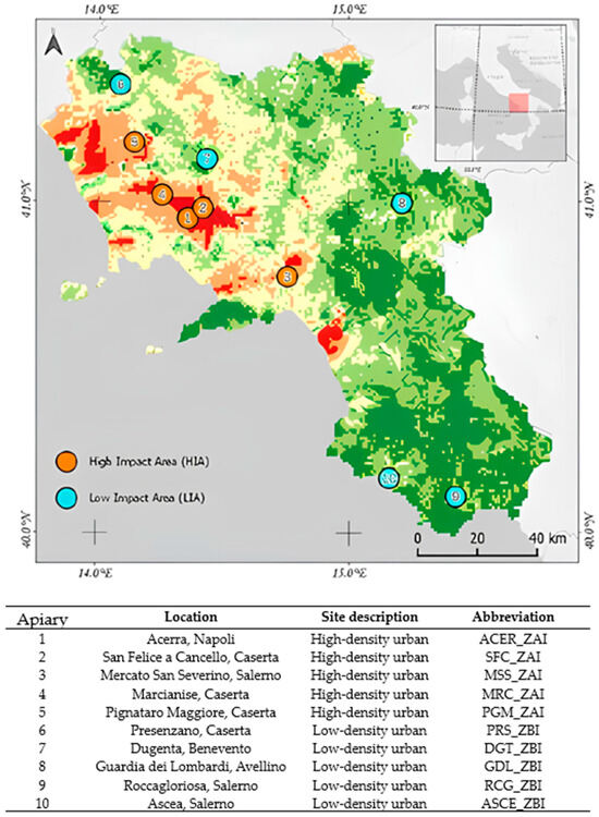 - Signorelli, D.; D’Auria, L.J.; Di Stasio, A.; Gallo, A.; Siciliano, A.; Esposito, M.; De Felice, A.; Rofrano, G. Application of a Quality-Specific Environmental Risk Index for the Location of Hives in Areas with Different Pollution Impacts. Agriculture 2023, 13, 998. [Google Scholar] [CrossRef]