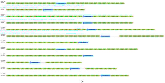 Another interesting characteristic of our collection was the presence of CRISPR/Cas systems in 18% of the isolates. Type I-E systems were found in 12 isolates, and type I-F systems were present in 6 other isolates. None of the CRISPR/Cas-positive isolates were found to be positive for more than one system. Of note, the percentage of CRISPR/Cas-positive E. coli isolates was low compared to percentages observed in other bacterial species, like P. aeruginosa [51]. The low percentage of CRISPR/Cas-positive isolates might be associated with the wide variety of plasmid replicons observed in the sequenced isolates (Table 4). Several previous studies have reported that plasmids have been involved in the spread of resistance genes [52]. Also, several studies have demonstrated the critical role of plasmids in the dissemination of virulence factors [53,54]. Such examples were also observed during this study, referring to the association of IncFIB (AP001918) replicon with the hlyF and estC virulence genes. The hlyF encodes hemolysin F, a functional ortholog of CrpA, which is a short-chain dehydrogenase/reductase (SDR) that contributes to resistance against colistin and antimicrobial peptides. SDRs also induce the production of OMVs, which block autophagic flux. Previous studies have shown that HlyF is encoded by virulence plasmids of E. coli [53]. The estC gene encodes an esterase that could be implicated in the ethyl acetate and/or ethyl lactate biosynthesis. Previous studies have shown that the ester biosynthesis capacity by lactic acid bacteria (LAB) is of great interest in view of fruity flavor formation during sourdough and sourdough bread productions [55].