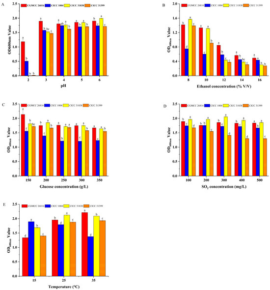 (A) Comparison of pH tolerance between Pichia kudriavzevii GAAS-JG-1 (CGMCC No. 26816) and Other Non-Saccharomyces Yeasts. (B) Comparison of Ethanol tolerance between Pichia kudriavzevii GAAS-JG-1 (CGMCC No. 26816) and Other Non-Saccharomyces Yeasts. (C) Comparison of glucose tolerance between Pichia kudriavzevii GAAS-JG-1 (CGMCC No. 26816) and Other Non-Saccharomyces Yeasts. (D) Comparison of sulfur dioxide tolerance between Pichia kudriavzevii GAAS-JG-1 (CGMCC No. 26816) and Other Non-Saccharomyces Yeasts. (E) Comparison of temperature tolerance between Pichia kudriavzevii GAAS-JG-1 (CGMCC No. 26816) and Other Non-Saccharomyces Yeasts.