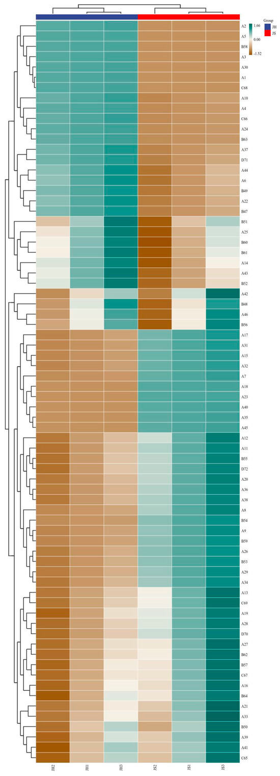 Heatmap cluster analysis of volatile flavor compounds in sea buckthorn wine under different fermentation conditions. JS: Monoculture fermentation of Saccharomyces cerevisiae (CICC 32168); JH: Saccharomyces cerevisiae (CICC 32168) was inoculated initially, and Pichia kudriavzevii GAAS-JG-1 was inoculated after 24 h.
