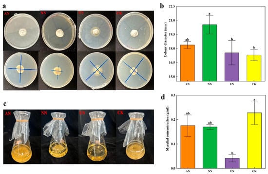 The effects of ammonium nitrogen (AN), nitrate nitrogen (NN), and urea (UN) additions on (a,b) colony diameter in solid culture medium and (c,d) mycelial concentration in liquid culture medium of Epichloë endophyte strains. CK: solid and liquid PDA medium. Different lowercase letters indicate significant differences.