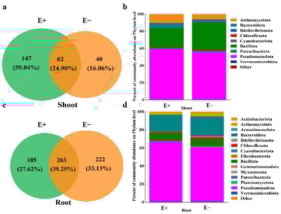 Venn diagram showing the number of shared and unique ASVs, and bar plots showing bacterial microbial community composition in (a,b) shoot and (c,d) root between Epichloë endophyte–infected (E+) and Epichloë endophyte–free (E–) plants under low-concentration urea treatment, separately.