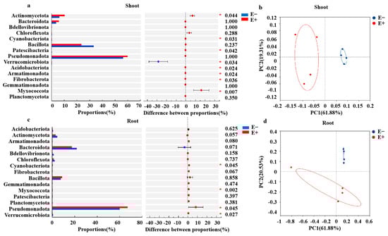 Wilcoxon rank sum test analyzes bacterial communities that differ significantly in (a) shoot and (c) root between Epichloë endophyte–infected (E+) and Epichloë endophyte–free (E–) plants under low-concentration urea treatment. X-axis: difference between proportions of bacterial communities at different phyla; Different colored boxes indicate the E+ and E− plants; Y-axis represents the average relative abundance of bacterial phyla between the E+ and E− plants. Principal co-ordinates analysis (PCoA) plot based on Euclidean distances to detect similarity or difference structure of the bacterial community composition in shoot (b) and root (d) of Achnatherum inebrians infected and uninfected with Epichloë gansuensis endophyte under low-concentration urea treatment. Red * represent significant differences between E+ and E− plants at p < 0.05.