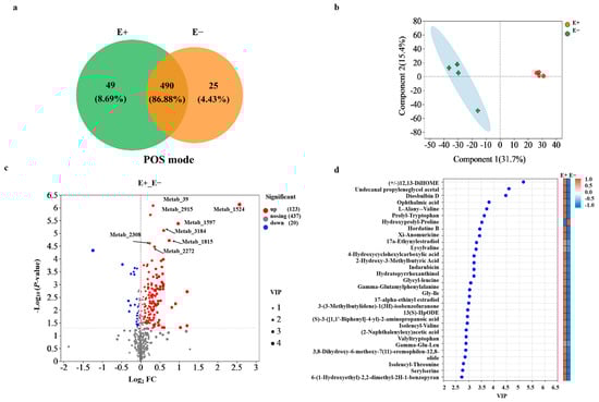 Multivariate statistical analysis was performed on the Majorbio Cloud Platform (https://cloud.majorbio.com, accessed on 1 June 2024). Orthogonal least partial squares discriminant analysis (OPLS–DA) was performed using the ROPLS package (v 1.6.2) in R to identify metabolic changes between the E+ and E− samples. The stability and reliability of the model were evaluated using 7-fold cross-validation and response permutation testing. Differentially expressed metabolites were identified on the basis of the variable importance in the projection (VIP) score and the following parameters: VIP > 1; p value of Student’s t test < 0.05; and fold change (FC) < 1 or FC > 1, using the default settings. The biochemical pathways of the significantly different metabolites were mapped with metabolic enrichment and pathway analysis using the KEGG database. Significantly enriched pathways were identified using Fisher’s exact test (p < 0.05) implemented in the Stats 2.0 package in R and the SciPy package (v 1.11.4) (https://docs.scipy.org/doc/scipy/, accessed on 1 June 2024).