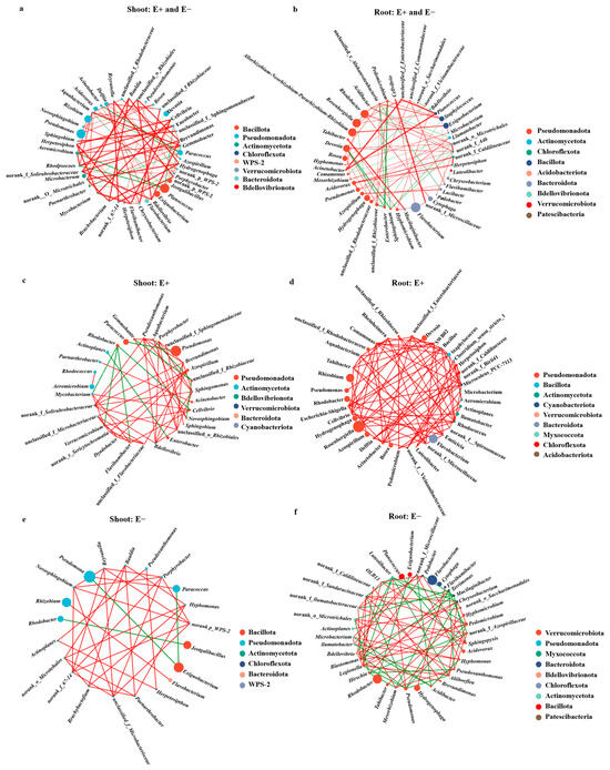 Co-occurrence networks of shoot and root bacterial communities based on a correlation analysis under low-concentration urea treatment: (a) the E+ and E− shoots; (b) the E+ and E− roots; (c) the E+ shoots; (d) the E− shoots; (e) the E+ shoots; (f) the E− roots. The red and green connecting lines indicate the positive and negative relationship between bacterial communities, respectively.