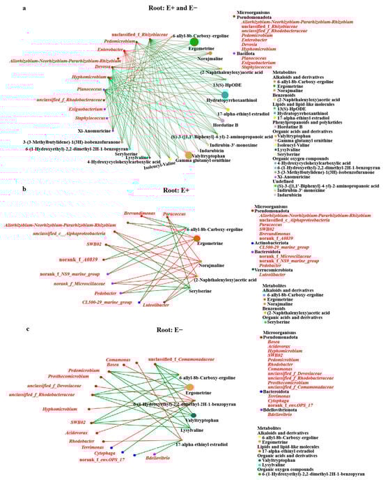 Co-metabolism network shows the associations between different metabolites and microorganisms: (a) the E+ and E− root compounds and bacterium; (b) the E+ root compounds and bacterium; (c) the E− root compounds and bacterium. Red/green lines: the positive/negative correlations between compounds and bacteria.