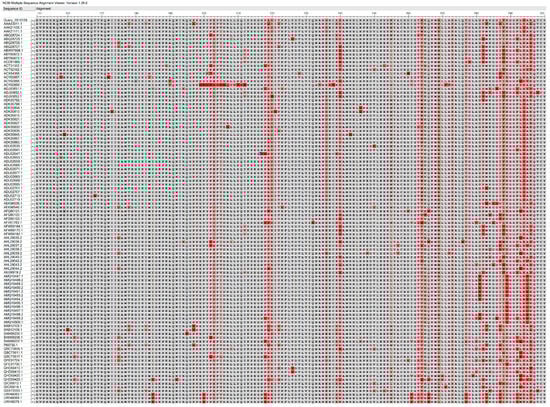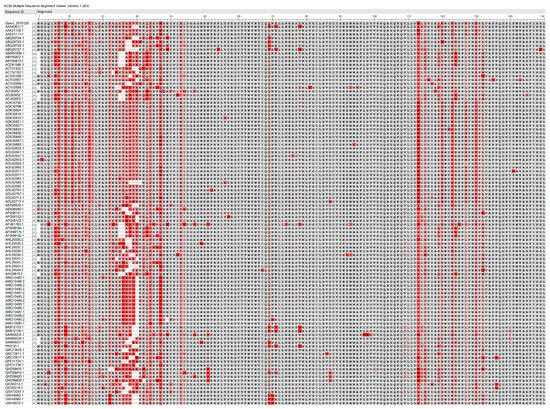Comparison of amino acid sequences of the p26 protein among different EIAV strains. Darker red colors indicate lower consistency.