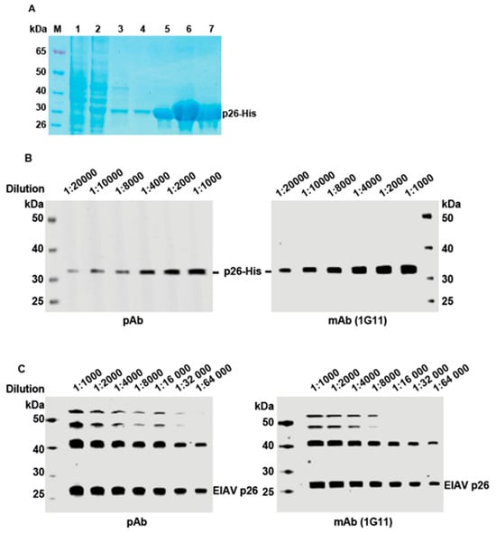 Preparation of antibodies and validation of their specificity. (A) Purified p26 protein of EIAV with His tag M: protein maker; 1: uninduced; 2: induced with IPTG; 3–4: conducted with wash buffer; 5–7: purified His-p26 protein. (B) The samples of purified p26-His protein were diluted to various concentrations for the WB and detected by pAb and 1G11 mAb. (C) The vCMV3-8 was diluted to various concentrations for the WB and detected by pAb and 1G11 mAb.