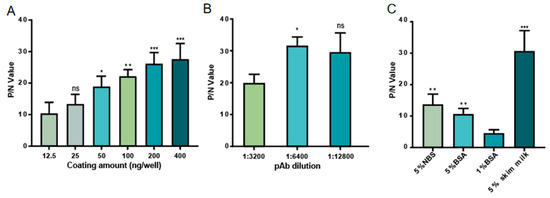 To develop a high-sensitivity AC-ELISA, it is necessary to optimize assay conditions, including coating concentration of the capture antibody, blocking buffer, and concentration of pAb. The results showed that the optimal 1G11 mAb coating concentration was 400 ng/well (Figure 4A), the optimal dilution of the pAb was 1:6400 (Figure 4B), and the most suitable blocking buffer was 5% skim milk (Figure 4C).