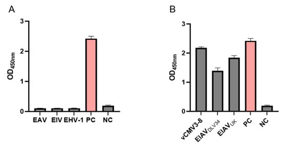 To confirm the specificity of the p26 AC-ELISA assay, EHV-1, EAV, EIV, EIAV-luc (positive control, PC), and dilution buffer (negative control, NC) were analyzed using AC-ELISA as samples in separate reactions. As demonstrated in Figure 5A, EIAV-luc exhibited specific reactivity with no detectable cross-reactions against EHV-1, EAV, EIV, or NC. These results demonstrate that the assay is specific for detection of EIAV. To confirm that the novel AC-ELISA demonstrated broad-spectrum ability to detect different EIAV strains, the EIAVDLV34, EIAVUK, and vCMV3-8 strains were analyzed using AC-ELISA as samples in separate reactions [34]. As shown in Figure 5B, all strains exhibited a strong positive reaction, except for the negative control. This indicates that the AC-ELISA established in this study exhibits excellent recognition capability for different EIAV strains, while showing no cross-reactivity with other common equine viruses.