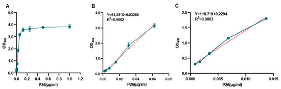 Sensitivity of the ELISA for p26. (A) Different concentrations of purified p26 protein with a serial two-fold dilution from 1 μg/mL to 0.002 μg/mL were tested. (B) The linear range of determination for EIAV p26 detection was 0.002–0.06 μg/mL. (C) Serially two-fold-diluted EIAV-luc was quantified by AC-ELISA. The amount of EIAV-luc in the minimum virus dilution (8×) with the OD value in the dynamic range was calculated using the linear equation of p26. There was also a good linear relationship from 1:8 to 1:4096 dilutions of EIAV-luc. The error bar shows the means of triplicate. Blue data points: Raw experimental measurements used to generate the calibration curve. Red regression line: Quantification of the relationship between Y-axis and X-axis.