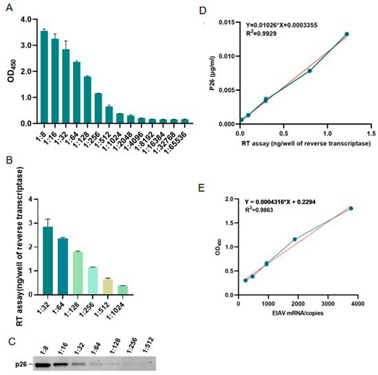 Comparison of the novel AC-ELISA and other methods. (A) A serially diluted EIAV-luc was quantified by AC-ELISA. (B) The EIAV-luc was serially diluted and used for reverse transcriptase activity. (C) The EIAV-luc was serially diluted and used for western blot detection of the p26 protein. (D) Correlation analysis between AC-ELISA and real-time qPCR detection of EIAV-luc. (E) Correlation analysis between AC-ELISA and real-time qPCR detection of EIAV-luc. Blue data points: Raw experimental measurements used to generate the calibration curve. Red regression line: Quantification of the relationship between Y-axis and X-axis.
