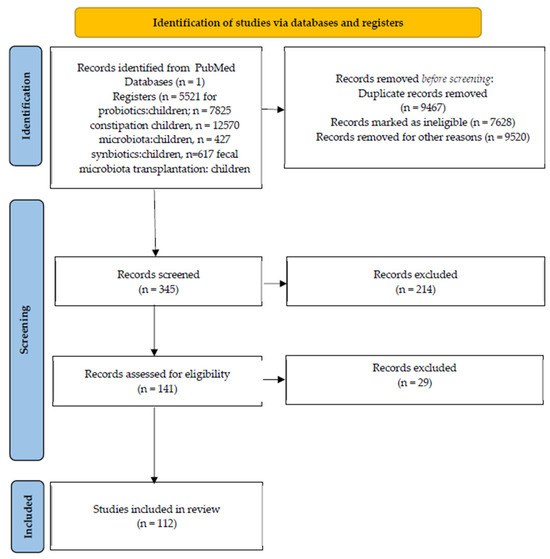 The major limitations of most of the studies involving pediatric patients with constipation is the lack of a holistic approach to these children, consisting of the combined assessment of diet, lifestyle, and life events that might have triggered the onset of constipation. Moreover, almost all studies have failed in characterizing the host’s gut microbiome before initiating the treatment. A potential limitation of our review is that we did not also assess the impact of microbiota and -biotics in children with secondary constipation, but since this is a large topic, we aim to target it in future research.