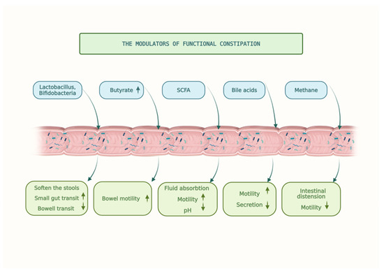 According to the World Health Organization and the Food and Agriculture Organization of the United Nations, probiotics are live microorganisms with a benefit on the host’s health if administered in proper amounts [38]. The positive impact of probiotics on the gut ecosystem of patients suffering from constipation has been explained by mechanisms like replenishing lacking beneficial resident bacteria, downregulating mucosal inflammation, or producing SCFAs [1,31,39,40]. Several mechanisms are emphasized regarding the reasons why probiotics might express a positive effect in constipation. One of them, and probably the most important, focuses on the fact that constipation is associated with dysbiosis, and that probiotics improve the composition of the gut microbiota, resulting in the improvement of constipation-related symptoms, although is it not completely understood whether dysbiosis precedes constipation or if it is a consequence of constipation [41,42,43]. Another mechanism is related to the colonic pH, since it is well documented that a lower pH is associated with better colonic peristalsis and subsequent faster colonic transit time. Studies prove that probiotics increase the production of short-chain fatty acids, especially lactic and acetic acids, resulting in a lower colonic pH [41,42].