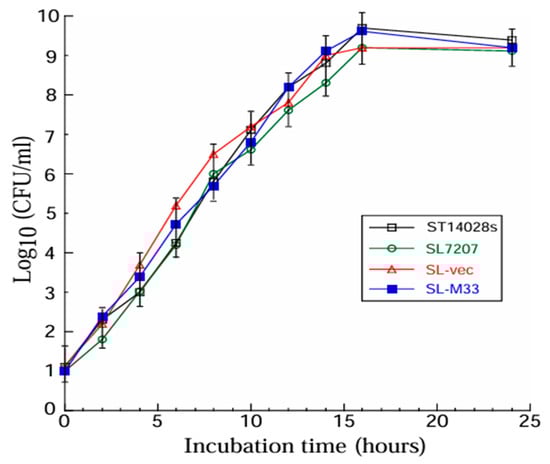 In vitro growth of Salmonella clinical strain ST14028s, mutant strain SL7207, empty vector-containing vaccine SL-vec, and M33-containing vaccine SL-M33 in LB broth. Data and error bars represent mean values ± standard deviations (SDs) calculated from the results of three independent experiments, with each independent experiment performed in duplicate. Experimental procedures and data analyses are described in the Section 2.