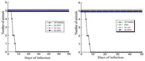 To confirm the attenuation of the virulence of the constructed vaccines in vivo, we examined the ability of SL-M33 and SL-vec to kill mice. Groups of mice were intragastrically infected with Salmonella, and their survival was monitored. All animals were dead within seven days after being infected at a single dose of 2 × 103 CFU per animal with clinical strain ST14028s, which is a known virulent strain of Salmonella (Figure 2, left panel). On the contrary, no death was observed in mice infected with SL-M33, SL-vec, and SL-7207, even after a prolonged period of 60 days and a higher dose of 1 × 109 CFU per animal (Figure 2, left panel). Thus, SL-M33 and SL-vec were attenuated in vivo.