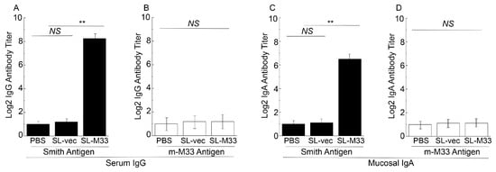 Serum IgG and mucosal IgA titers from pooled serum or mucosal wash samples collected at 42 days post immunization from mice that were administered with PBS only, SL-vec, or SL-M33 at days 0, 14, and 28. We conducted ELISA assays to obtain serum IgG titers against antigen samples from Smith-infected (A) and m-M33-infected cells (B) and obtain mucosal IgA titers against antigen samples from Smith-infected (C) and m-M33-infected cells (D). Data and error bars represent mean values ± standard deviations (SD) calculated from the results of three independent experiments with each independent experiment performed in duplicate. Experimental procedures and data analyses are described in the Section 2. ** p < 0.05. NS, not significant.