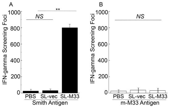 T cell responses elicited by the Salmonella vaccines. We harvested splenocytes (n = 5) at 42 days post immunization from mice that were administered with PBS, SL-vec, or SL-M33 at days 0, 14, and 28, and then exposed the splenocytes to antigen samples from Smith-infected (A) or m-M33-infected cells (B) for 48 h. The number of IFN-γ-producing T cells, shown as spot-forming cells (SFCs), per 1 × 106 cells, was obtained by ELISPOT assays. Data and error bars represent mean values ± standard deviations (SDs) calculated from the results of three independent experiments, with each independent experiment performed in duplicate. Experimental procedures and data analyses are described in the Section 2. ** p < 0.05. NS, not significant.