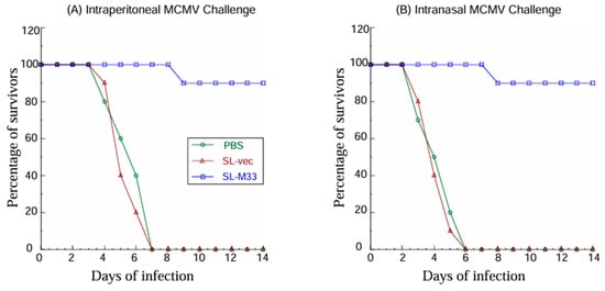 Viability of mice upon MCMV challenge. Mice (10 animals per group) were administered with PBS only, SL-vec, or SL-M33 at days 0, 14, and 28, and then intraperitoneally (A) or intranasally (B) infected with salivary gland-passaged MCMV Smith strain (1 × 106 PFU per mice) at 42 days post immunization; they were monitored daily for their viability.