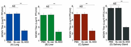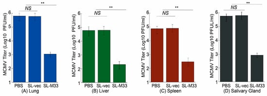 MCMV titers in lungs (A), livers (B), spleens (C), and salivary glands (D) in the vaccinated mice at day 5 after intranasal viral challenge. We administered mice (10 animals per group) with PBS only, SL-vec, or SL-M33 at days 0, 14, and 28, and at 42 days post immunization and infected them intranasally with MCMV Smith (5 × 104 PFU). Data and error bars represent mean values ± standard deviations (SDs) calculated from the results of three independent experiments, with each independent experiment performed in duplicate. Experimental procedures and data analyses are described in the Section 2. ** p < 0.05. NS, not significant.