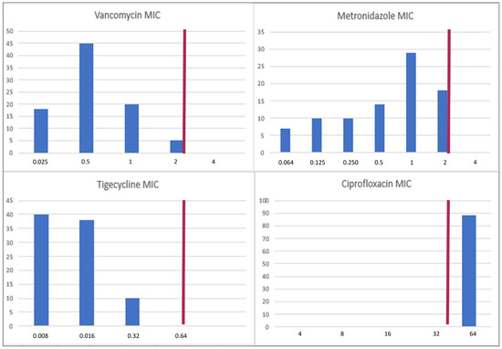 3.2. MICs of Vancomycin, Metronidazole, Tigecycline, and Ciprofloxacin