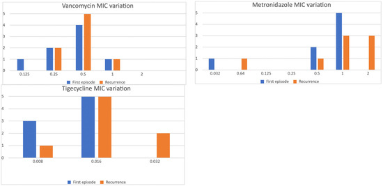 Sixteen isolates from both the first episode and recurrence were available for eight patients: three (37.5%) displayed a twofold MIC increase for vancomycin, six (75%) a twofold increase for metronidazole, and three (37.5%) a twofold increase for tigecycline. The variation in MIC distributions is presented in Figure 2. The observed increase in MIC did not result in a shift across the susceptibility breakpoints.