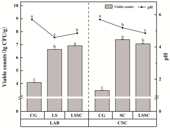 Compared to the CG group, the pH values of L. sakei and S. carnosus single and co-fermented sausages decreased after 48 h (p < 0.05): CG group: 5.70; LS group: 4.59; SC group: 5.19; LSSC group: 4.86. The results indicate that S. carnosus has acid-producing abilities during single fermentation (p < 0.05), but the effect is not as strong as that of L. sakei (Figure 1).