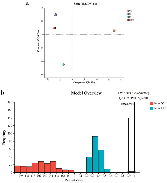 PLS-DA (Partial Least Squares Discriminant Analysis) analysis was conducted for the non-volatile components of the four groups (CG, LS, SC, and LSSC) (Figure 2a). From the PLS-DA Score plot, the degree of clustering and dispersion of the samples could be perceived. The nearer the sample distribution points were to each other, the more alike the composition and concentration of variables or molecules in those samples were. On the contrary, the farther apart the sample points were, the greater the disparity was. The significant separation of the four groups in the plot indicated a distinct and effective classification. The OPLS-DA (Orthogonal Partial Least Squares Discriminant Analysis) models were backed by high values of R2Y and Q2 (R2Y = 0.999, Q2 = 0.993) (Figure 2b), suggesting that the models had good accuracy and predictability. With the addition of probiotics and fermentation, significant changes in metabolites were observed compared to the CG group. The LS group was closer to the LSSC group than to the SC group, indicating that the molecular composition of the LS and LSSC groups is similar. This suggests that L. sakei plays a dominant role during the co-fermentation with S. carnosus.