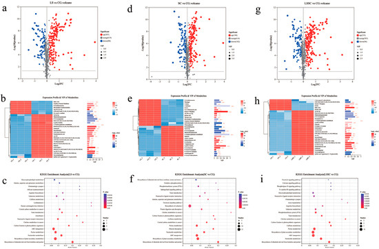 The volcano plots of differential metabolites in pairwise comparisons of LS and CG (a), SC and CG (d), and LSSC and CG (g); the clustering heatmap and VIP bar chart analysis of the top 30 significant differential metabolites of LS and CG (b), SC and CG (e), and LSSC and CG (h); the KEGG pathway differential abundance score plots of the differential metabolites of LS and CG (c), SC and CG (f), and LSSC and CG (i). * indicates p < 0.05, ** indicates p < 0.01, *** indicates p < 0.001.