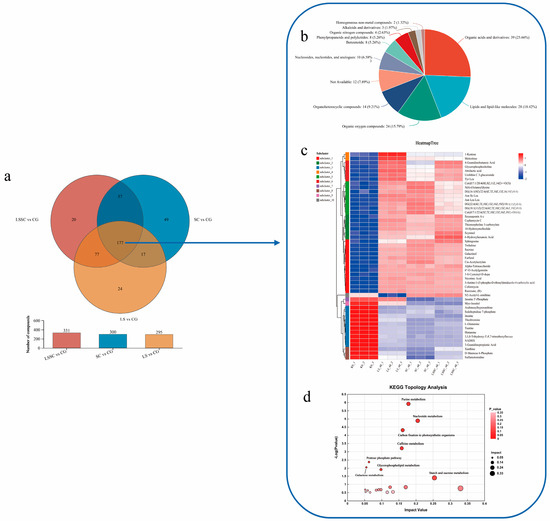 To enhance data visualization, a Venn diagram of the differentially expressed metabolites after screening was created. Compared to the CG group, 295, 300, and 331 differential metabolites were detected in LS, SC, and LSSC, respectively. A total of 177 common metabolites were identified across the three groups (Figure 4a). We further analyzed these 177 common differential metabolites and matched them with the Human Metabolome Database (HMDB), classifying them into 11 different categories. The main categories included organic acids and derivatives (25.66%), lipids and lipid-like molecules (18.42%), organic oxygen-containing compounds (15.79%), and organic heterocyclic compounds (9.21%) (Figure 4b).