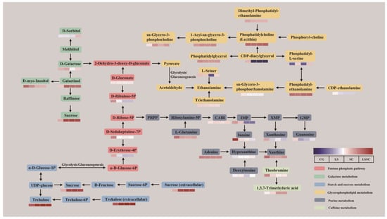 Based on the KEGG pathway analysis, eight major metabolic pathways were identified. The six pathways that have the most significant impact on beef sausage metabolites during the single and co-fermentation of L. sakei and S. carnosus are summarized and depicted in Figure 5. The changes in metabolite content during the single and co-fermentation of L. sakei and S. carnosus (Table S1) and chromatograms of individual microorganisms and co-fermentation finished beef sausages (Figure S1) are in the Supplementary Materials. In the pentose phosphate pathway, the levels of D-ribulose-5P, D-sedoheptulose-7P, and D-erythrose-4P in the LS, SC, and LSSC groups were all lower compared to the CG group, indicating that these substances were utilized during the fermentation process. The pentose phosphate pathway is one of the methods of glucose oxidation and breakdown, where glucose is directly oxidized through dehydrogenation and decarboxylation, bypassing glycolysis and the tricarboxylic acid cycle. Studies have shown that the primary pathway for glucose oxidation and breakdown during the single and co-fermentation of L. sakei and S. carnosus is the pentose phosphate pathway. Another noteworthy observation is that galactose metabolism and starch and sucrose metabolism can synthesize sucrose through the pentose phosphate pathway, and the sucrose content in the LS, SC, and LSSC groups was significantly higher compared to the CG group. Sucrose can add sweetness to fermented sausages, contributing to the formation of their unique flavor. In the starch and sucrose metabolism pathway, the content of trehalose also increased after fermentation by the strains. Trehalose, a natural sweetener, plays a role in preventing food spoilage, maintaining freshness, and enhancing food quality, which is beneficial for the flavor formation of fermented sausages. Regarding D-galactose, the content in the LS group increased by 0.02-fold compared to the CG group, while in the SC group and LSSC group, the content decreased by 0.16-fold and 0.06-fold, respectively. This indicates that D-galactose produced during the fermentation of L. sakei can be utilized by S. carnosus. D-Galactose is commonly used as a sugar substitute [35]. Regarding D-sorbitol, its content decreased in the LS and SC groups compared to the CG group, while in the LSSC group, it increased by 0.2-fold compared to the CG group, indicating that the co-fermentation of L. sakei and S. carnosus promotes the production of D-sorbitol. Purine metabolism is fundamental to nucleic acid synthesis and plant metabolic pathways [36]. Several key purine metabolites, including IMP, inosine, xanthine, guanosine, and xanthosine, showed reduced abundance during the fermentation process. These metabolites are critical for microbial growth and reproduction, and similarities between LAB and CNS have been reported. Previous studies have shown that changes in different metabolic pathways and metabolite levels can influence bacterial proliferation during fermentation. Bacterial proliferation depends on metabolite changes, and this interaction leads to increases or decreases in metabolite levels during fermentation [37]. In glycerophospholipid metabolism, CDP-diacylglycerol (CDP-DAG) is utilized during both the single and co-fermentation of L. sakei and S. carnosus. CDP-DAG acts as an intermediate at a key branching point in lipid metabolism. It participates in multiple biosynthetic pathways, leading to the formation of various phospholipid end products. In contrast, L-serine is a significant intermediate metabolite in biological systems and serves as a precursor for the synthesis of several compounds, including glycine, nucleotides, choline, and phospholipids. The content of L-serine in the SC group decreased by 0.49-fold compared to the CG group. Phosphatidyl-L-serine is an important membrane phospholipid found in bacteria, yeast, plants, and mammalian cells. The content of phosphatidyl-L-serine in the LS and LSSC groups increased by 0.7 and 0.76-fold, respectively, compared to the CG group. It can be observed that the trend in metabolite expression in glycerophospholipid metabolism is consistent in both the LS and LSSC groups. In caffeine metabolism, theobromine serves as the primary bitter component in chocolate. When compared to the CG group, the content of theobromine in the groups supplemented with strains exhibited varying degrees of decline. This downward tendency has the potential to mitigate bitterness and enhance the flavor of fermented sausages.