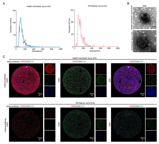 Exosome microarray detection technology is a method used for the detection of EVs that has emerged in recent years; it captures exosomes in samples using capture antibodies and enables the detection of relevant protein markers against them [59]. In this paper, we determined the preparation of the EVs by detecting the standard EVs protein markers CD63, CD81, and CD9 in serum EVs from TB patients, and we also determined the fluorescence expression of CD63, CD81, and CD9 in the TB patient group by analyzing the fluorescence intensity of them when CD63, CD81, and CD9 were used as the capture antibodies. Moreover, it was found that the fluorescence intensity of CD63 and CD9 in the serum EVs of the TB patient group was lower than that in the healthy individuals’ group, which also suggests that although the protein markers of EVs, namely, CD63, CD81, and CD9, are present in almost all EVs [60], the current assay mainly focuses on the overall protein expression content, and the co-expression of each marker in EVs is less frequently reported, which also suggests that the difference in co-expression may be related to the diagnosis or treatment of the disease, which can be explored in greater depth in the future.