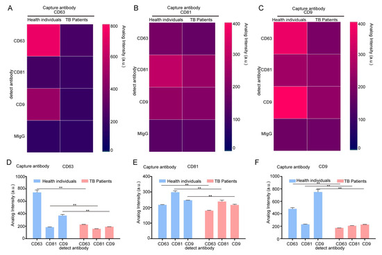 When CD63 was used as the capture antibody, the fluorescence intensities of CD63 and CD9 in the TB patient group were lower than that those in the healthy group. When CD81 was used as the capture antibody, the fluorescence intensity of CD81 in serum EVs in the TB patient group was lower than that in the healthy group. When CD9 was used as a capture antibody, the fluorescence intensity of CD63 and CD9 in the serum EVs of the TB patient group was lower than that of the healthy group (Figure 1C). Based on the fluorescence results presented in Figure 1C for fluorescence expression statistics, the statistical results of serum EVs in the healthy group and the patient group under different capture antibodies were obtained. The heat map (Figure 2A–C) and the bar chart (Figure 2D–F) are both different manifestations of the same statistical method. In the heat map, the more intense the red color, the higher the fluorescence intensity. When CD63 was used as the capture antibody, the fluorescence intensities of CD63 and CD9 in the TB patient group serum EVs were lower than those of the healthy group. When CD81 was used as a capture antibody, the fluorescence intensity of CD81 in serum EVs in the TB patient group was lower than that in the healthy group. When CD9 was used as the capture antibody, the fluorescence intensities of CD63 and CD9 in the serum EVs of the TB patient group were lower than those of the healthy group (Figure 2A–C). The expression results in the bar charts presented in Figure 2D–F are consistent with the analysis results of the fluorescence map and the heat map of fluorescence intensity. Moreover, when CD9 is used as the capture antibody, the fluorescence values of CD63 and CD9 in the healthy group are higher than those in the patient group, and there is a significant difference between the two groups. This finding indicates that the number of EVs co-expressing CD63 and CD9 in the serum group of TB patients is lower than that in the healthy group, which may be a relevant indicator for TB detection in the future.