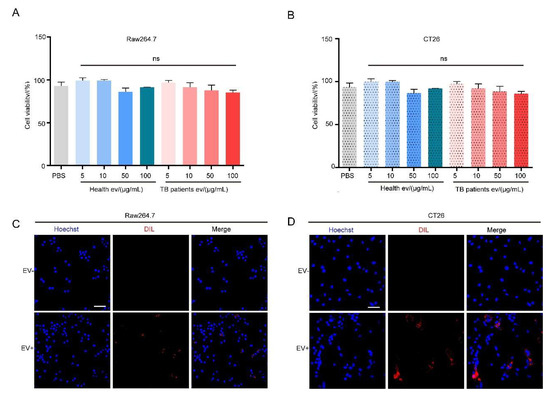 Research has shown that EVs can be endocytosed by cells, given the fact that they are cell-derived and possess a membrane structure similar to that of cells. In this study, we used EVs extracted from healthy individuals’ serum and TB patients’ serum quantified via BCA; the measured protein concentration was used as a basis to represent the number of EVs for subsequent assays [54], and the CCK-8 assay was performed following the co-incubation of EVs of different protein concentrations with CT26 or RAW264.7 cells. Our results demonstrated that RAW264.7 and CT26 cell activities were not disturbed at EV concentrations of 5, 10, 50, and 100 μg/mL (Figure 3A,B). In addition, we prepared Dil-labeled TB patients’ serum EVs, incubated them with RAW264.7 and CT26 cells for 12 h, respectively, and performed confocal immunofluorescence microscopy analysis. The results demonstrated that red fluorescence appeared in the cells represented by blue nuclei, indicating that both cells could endocytose serum EVs (Figure 3C,D).