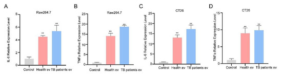 The results of a number of studies have demonstrated that EVs not only act in a cargo transportation capacity but also exert functions such as regulating cell physiological activities [55]. The expression of cytokines IL-6 and TNF-α related to immune activation was detected at the RNA levels. The experimental results demonstrate that, compared with the unstimulated group, both healthy and TB patients’ serum EVs induced high expression of IL-6 and TNF-α in RAW264.7 and CT26 cells (Figure 4A–D); however, the TB patients’ serum group EVs induced higher expression of IL-6 and TNF-α in RAW264.7 and CT26 cells than those of the healthy group, suggesting that TB serum EVs can stimulate cells to produce more intense inflammatory responses.