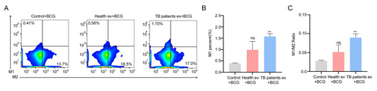 The polarization of macrophages in mice was influenced by the TB patients’ serum EVs. (A) Flow cytometry analysis of the macrophage horizontal of Balb/c mice. Control + BCG: BCG infection group; Health ev + BCG: mice stimulated with healthy individuals’ serum EVs alongside BCG infection; TB patients’ ev + BCG: mice stimulated with TB patients’ serum EVs alongside BCG infection. (B,C) Statistical data corresponding to flow cytometry results: M1 (B) and M1/M2 (C). The experiment was repeated three times in each group (n = 3); ** p < 0.01; ns: no significant difference. Control + BCG: BCG infection group; Health ev + BCG: mice stimulated with healthy individuals’ serum EVs alongside BCG infection; TB patients evs + BCG: mice stimulated with TB patients’ serum EVs alongside BCG infection.