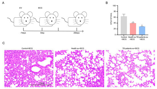 TB patients’ serum EVs inhibited the survival of BCG in mice. (A) Experimental process followed for the animal experiment: Balb/c mice were stimulated with serum EVs for one week and then stimulated with BCG, with sample collection performed based on the time starting point after BCG stimulation. (B) Balb/c mouse lung homogenate colony growth count (CFUs). Control + BCG: BCG infection group; Health ev + BCG: mice stimulated with healthy individuals’ serum EVs alongside BCG infection; TB patients ev + BCG: mice stimulated with TB patients’ serum EVs alongside BCG infection. The experiment was independently repeated three times in each group (n = 3); ** p < 0.01. (C) Lung H&E staining results of Balb/c mice; control + BCG: BCG infection group; Health ev + BCG: mice stimulated with healthy individuals’ serum EVs alongside BCG infection; TB patients ev + BCG: mice stimulated with TB patients’ serum EVs alongside BCG infection. Scale bar: 100 μm.