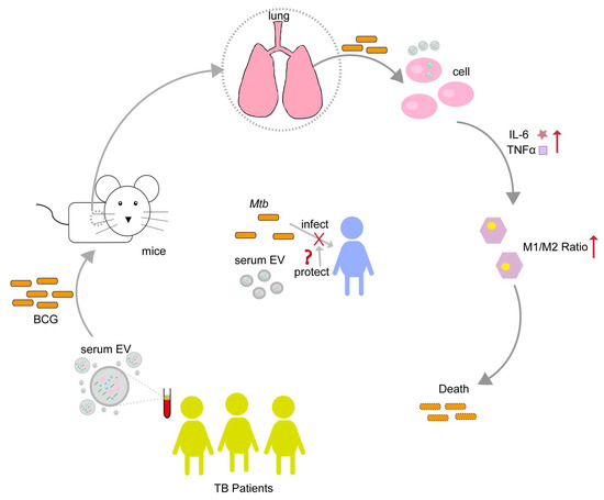 The current evolution of EVs related to the bodily fluids of TB patients is mainly focused on the development of markers related to TB detection [64]. The authors of recent studies have identified a variety of markers in different bodily fluids, such as serum, plasma, urine, and pleural fluid, such as LAM [65] and MPT64 [66]; however, little is known about the functions of EVs present in the bodily fluids of TB patients. In this study, we confirmed the presence of EVs in the serum of TB patients and the ability of their EVs to regulate cytokine release, promote macrophage polarization to the M1 type, and inhibit BCG survival in the lungs. The above results suggest to us that TB patients’ serum EVs have powerful physiological functions, and their performance in inhibiting BCG survival shows their significant potential in exploring areas such as the prevention of TB. Serum EVs are derived from the human body and contain richer content, and if they are used as a “drug” related to defensive therapy, they carry components homologous to the human body, meaning that they are safer for use, minimizing the occurrence of rejection reactions.