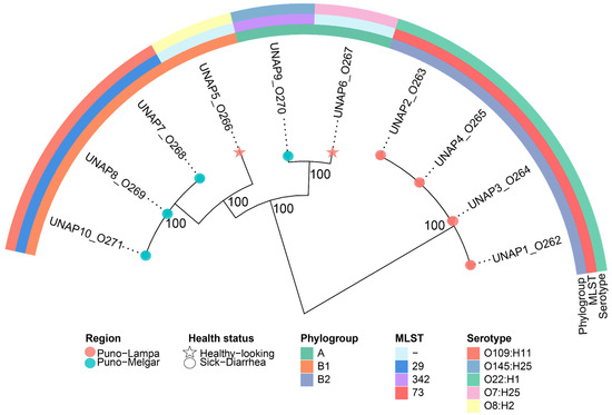 Maximum likelihood phylogenomic tree based on the core genome alignment of the ten E. coli strains isolated from diarrheic and healthy alpacas in Puno, Peru. The tree illustrates the evolutionary relationships among the isolates, with branch lengths representing genetic distances. Additional metadata, including Phylogroup, Region, MLST, Serotype, and Health status, is shown alongside the tree. Isolates from diarrheic and healthy alpacas are indicated with circles and stars at the tips, respectively.