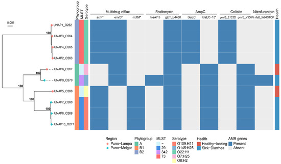 Serotyping revealed five distinct O:H serotypes among the isolates, with O22:H1 and O109:H11 being the most prevalent. All O22:H1 isolates belonged to phylogroup B2 and ST73 and were obtained from diarrheic alpacas in Puno-Lampa. Similarly, O109:H11 was associated with phylogroup B1, ST29, and was found in isolates from diarrheic alpacas in Puno-Melgar. Phylogroup analysis showed that most isolates from diarrheic alpacas belonged to phylogroups B2 and B1, with only one assigned to phylogroup A. The only isolates from healthy alpacas (both from Puno-Lampa) were assigned to phylogroups A and B1 (Table 1 and Table S1).