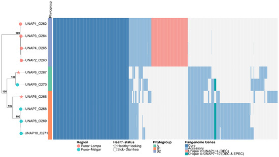 Principal Component Analysis (PCA), applied to assess the impact of accessory genome variation, revealed three strain clusters that were broadly similar but not identical to those formed in the phylogenetic tree. Notably, UNAP5—although phylogenetically closer to UNAP7, UNAP8, and UNAP10—clustered instead with UNAP6 and UNAP9, despite their differences in phylogroup, region, and health status (Figure S2a,b). Epidemiological factors such as geographic origin, health status, phylogroup, or MLST were not able to fully explain the observed clustering pattern (Figures S2 and S3). Nonetheless, a partial correspondence with geographic origin was observed (Figure S2a)—particularly in the separation of DEC isolates from Puno-Lampa and Puno-Melgar—with the exception of UNAP5 and UNAP6 isolates from healthy-looking alpacas in Puno-Lampa. These two strains presented accessory genome content and virulence profiles that more closely resembled DEC isolates from Puno-Melgar than those from their region of origin, as visually confirmed by the pangenome heatmap (Figure 4).