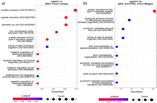 GO enrichment analysis based on the unique genes in both groups of DEC E. coli from the two sampling regions. Biological processes enriched in (a) UNAP1–4 (DEC from Puno-Lampa) and (b) UNAP7–10 (DEC and EPEC from Puno-Melgar).