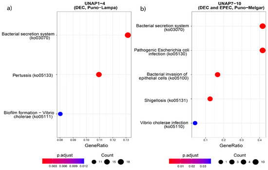 KEGG Pathway enrichment analysis based on the unique genes found in the groups of DEC E. coli from the two sampling regions. Pathways enriched in (a) UNAP1–4 (DEC from Puno-Lampa) and (b) UNAP7–10 (DEC and EPEC from Puno-Melgar).
