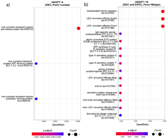 KEGG Orthology (KO) enrichment analysis based on the unique genes found in the groups of DEC E. coli from the two sampling regions. KO terms enriched in (a) UNAP1–4 (DEC from Puno-Lampa) and (b) UNAP7–10 (DEC and EPEC from Puno-Melgar).