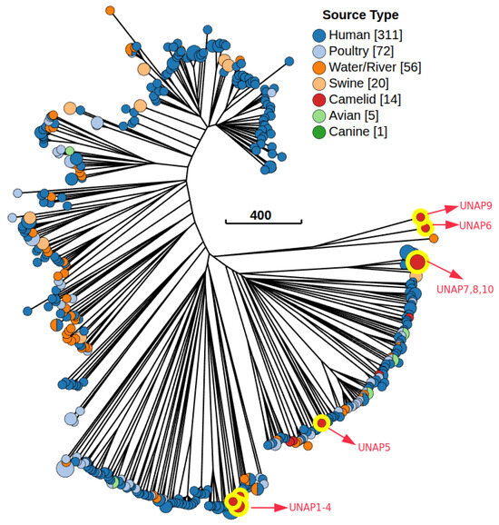 A Minimum Spanning Tree (MST) based on cgMLST profiles was constructed to examine the genetic relatedness between the 10 E. coli isolates from alpacas sequenced in this study and 469 Peruvian E. coli genomes from different hosts available in EnteroBase (Figure 8). The alpaca isolates were assigned to distinct cgST Complexes and distributed across multiple MST clusters corresponding to different phylogroups, consistent with the previously observed presence of diverse lineages among the isolates from this study (Figure S8a). UNAP1–4 (phylogroup B2, DEC) formed a tight subcluster within the cgST Complex 9 and were closely related to E. coli isolated from humans (Figure S8b). Similarly, UNAP7, UNAP8, and UNAP10 (phylogroup B1, DEC and EPEC, Puno-Melgar) belonged to cgST Complex 2 and clustered with strains from humans (B1, EHEC) and swine (B1, EPEC), indicating that these isolates are part of a multi-host lineage (Figure S8b,c). UNAP5 (B1, healthy alpaca isolate) also grouped near human isolates, while UNAP6 (A, EPEC) and UNAP9 (A, DEC and EPEC) clustered together with an environmental isolate from river water (phylogroup B1) rather than with other A phylogroup strains (Figure 8). Notably, the other four E. coli genomes isolated from alpacas available in EnteroBase (all phylogroup B1) in the MST were genetically distant from the isolates in this study, separated by multiple human-, swine-, poultry-, and water-associated strains, and did not form a single alpaca-associated genetic cluster (Figure 8).