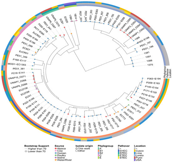 UNAP6 and UNAP9 (phylogroup A, EPEC) clustered together in a distinct subclade with ECB1 (an alpaca-derived EPEC genome from Cusco) as the nearest outgroup. These isolates were more closely related to E. coli from environmental (river water) and human sources than to other phylogroup A strains, echoing their unusual placement in the MST (Figure 8). UNAP5 (B1, healthy alpaca) formed a separate subcluster within the B1-dominated portion of the tree. While it clustered near three other alpaca-derived genomes (PSU-0717, PSU-0719, PSU-0720), its closest neighbors were human-derived isolates from both Lima and Cusco (Figure 9).