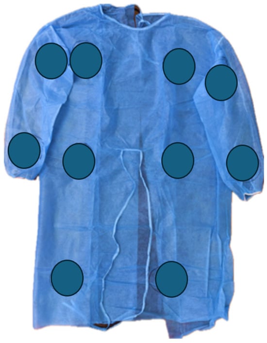 Image of an isolation gown with the predetermined areas to be cultured marked in circles.