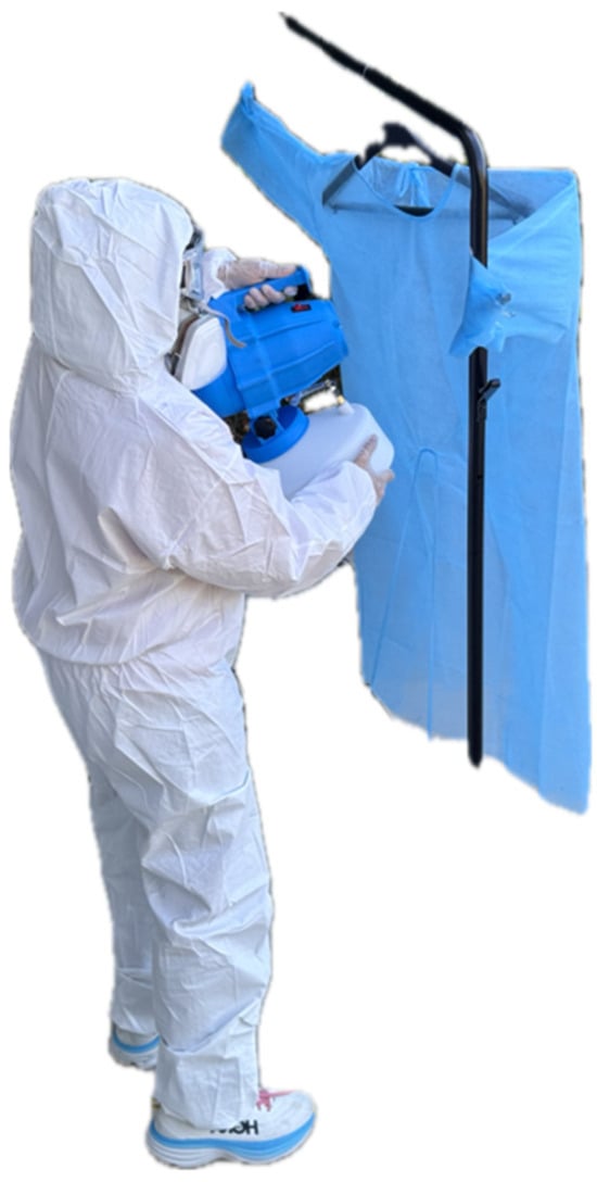 Ten gowns were then fogged with 12% (120,000 PPM) HP (SimpleNature (brand), Pacific Innovators (manufacturer), Elk Grove Village, IL, USA) (Group 2), after donning coveralls, a respirator, gloves, goggles, and shoe covers (Figure 2).