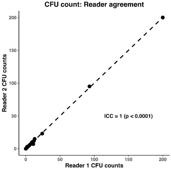 Intraclass correlation coefficient (ICC) of 1, showing there is strong agreement between the CFU counts of Reader 1 (SI) and Reader 2 (AV).