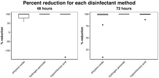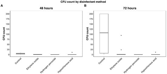 CFU counts by disinfectant method at 48 and 72 h. (A) Represents CFU at 48 h by disinfection method. (B) Represents CFU at 72 h by disinfection method. Black dots indicate outliers and were defined as 1.5 × IQR (interquartile range) below the first quartile or above the fourth quartile. CFU counts were lower for ethylene oxide, hydrogen peroxide and hypochlorous acid than controls (p < 0.0001) at both timepoints. No significant differences were detected among ethylene oxide, hydrogen peroxide and hypochlorous acid at either timepoint.